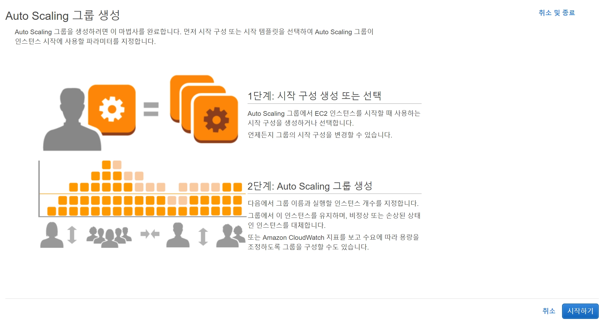 [Auto Scaling 그룹생성]을 클릭하면 단계별 구성을 확인 할 수 있다. 하단 우측 [시작하기]를 클릭한다.