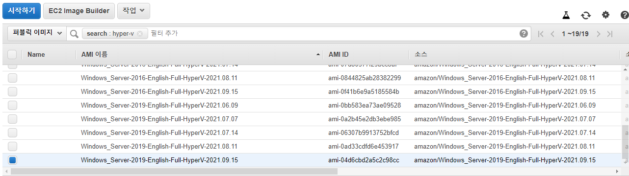 EC2 > AMI 메뉴에서 퍼블릭 이미지를 선택하고 "hyper-V"를 검색하면 많은 AMI들이 나오는데 필요한 버전을 선택하자.