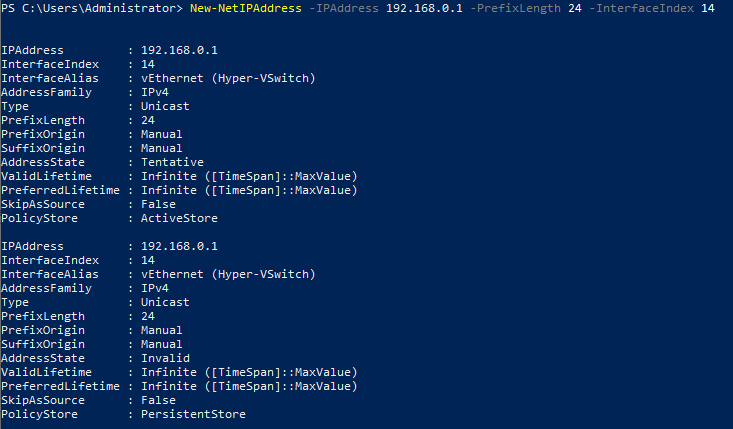 Run the following PowerShell command to configure the Hyper-V Virtual Ethernet adapter with the NAT gateway IP address. This IP address used as default gateway (Router IP) for the guest VMs. The following command sets the IP address 192.168.0.1 with a subnet mask 255.255.255.0 on the Interface (Interface Index 14):